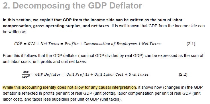 Autorzy badania dokonują w nim rozbicia na składowe deflatora cen konsumpcyjnych, czyli w skrócie rozbicia wzrostu cen na: ceny importowe, podatki, koszty płac oraz zyski przedsiębiorstw (nadwyżkę operacyjną brutto). Co ważne, wskazują, że wykonane przez nich ćwiczenie jest obrazem (accounting identity) obecnej sytuacji wynikającym z rachunków narodowych, a nie ciągiem przyczynowo-skutkowym.