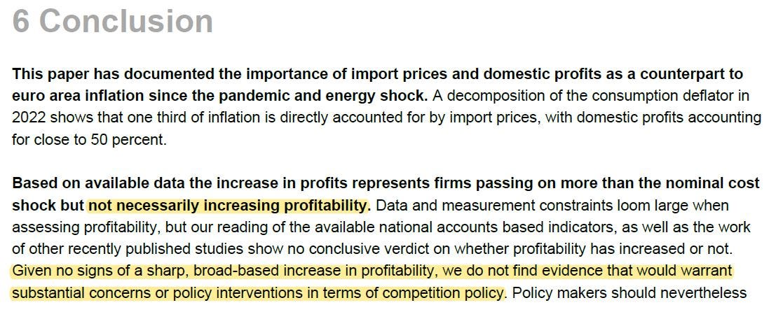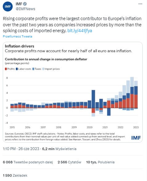 Całą powtórną burzę o “greedflation” wywołał jeden z tweetów IMF, który odnosił się do badania Hansen, N.J., Toscani, F. and Zhou, J., 2023. Euro Area Inflation after the Pandemic and Energy Shock: Import Prices, Profits and Wages opublikowanego w ramach IMF Working Paper. Mało kto zerknął jednak, co tak naprawdę napisali autorzy tego badania.