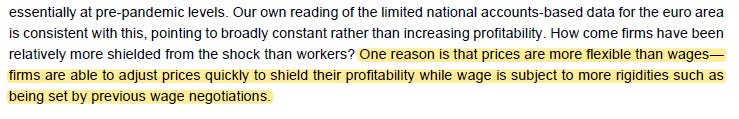 A teraz uwaga, główne wnioski. Autorzy stwierdzają, iż nie ma żadnych oznak skokowego, znaczącego wzrostu rentowności przedsiębiorstw. Nie ma więc żadnego “greedflation”, nie ma spirali marżowo-cenowej. Jest obraz rzeczywistości, który mówi o tym, że firmy lepiej poradziły sobie z inflacją, niż pracownicy, co może wynikać z faktu, iż dostosowanie cen jest procesem szybszym niż dostosowanie płac1. To ważna informacja na wielu poziomach, ale w żaden sposób nie równa z promowanym twierdzeniem, iż firmy *odpowiadają* za inflację.